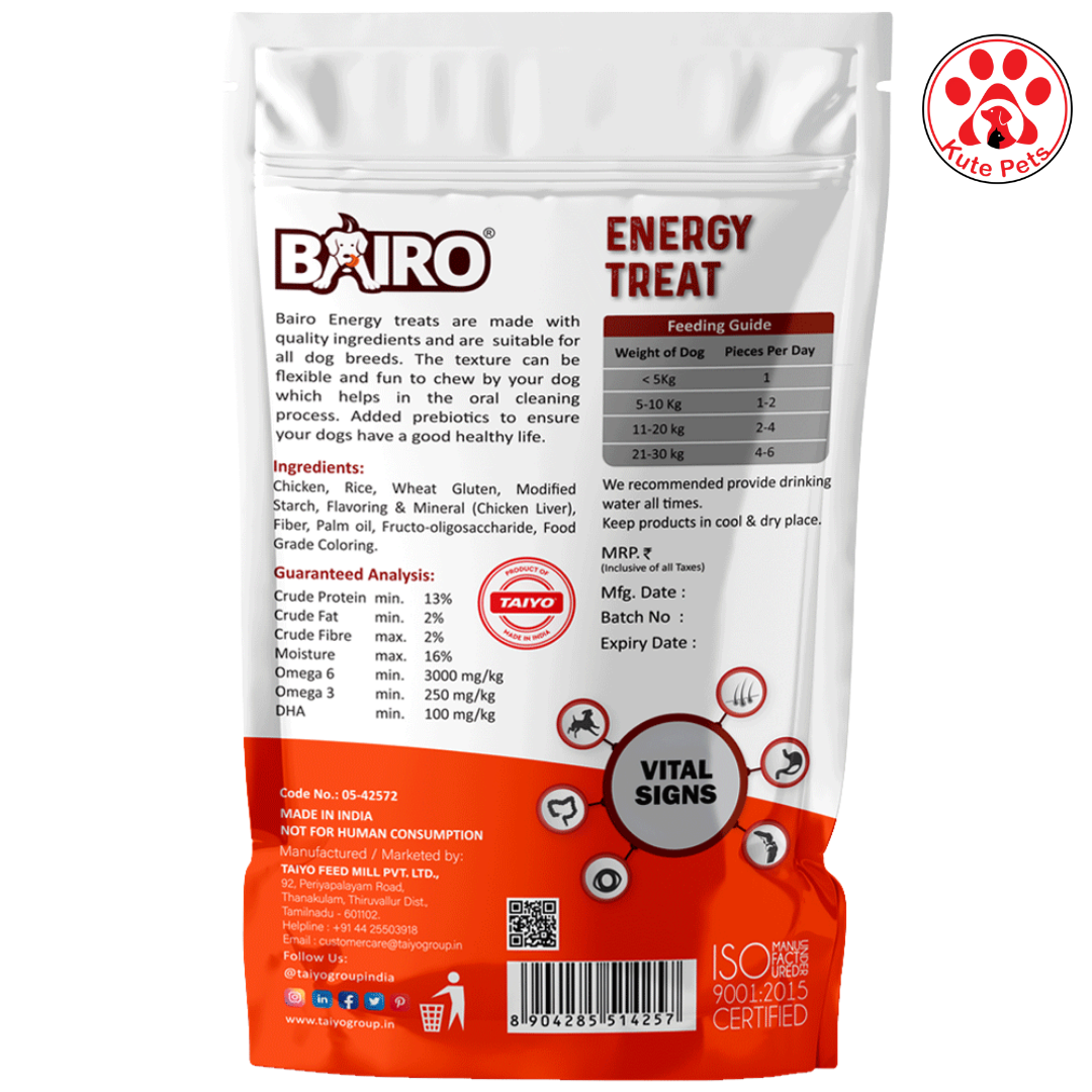 Bairo energy treats are made with quality ingredients and are suitable for all dog breeds. The texture can be flexible and fun to chew by your dog which helps in the oral cleaning process. Added prebiotics to ensure your dogs have a good healthy life.