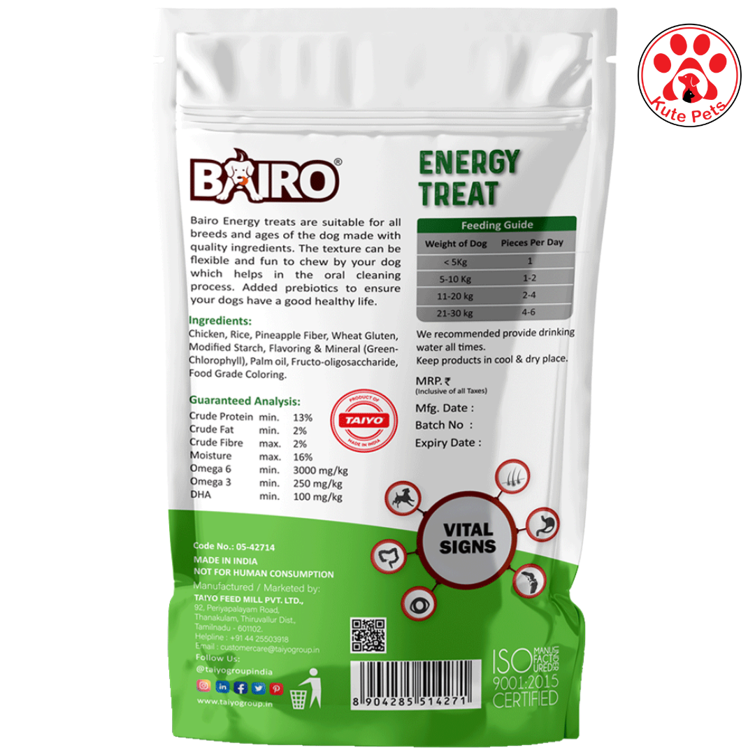 Bairo energy treats are suitable for all breeds and ages of the dog made with quality ingredients. The texture can be flexible and fun to chew by your dog which helps in the oral cleaning process. Added prebiotics to ensure your dogs have a good healthy life.