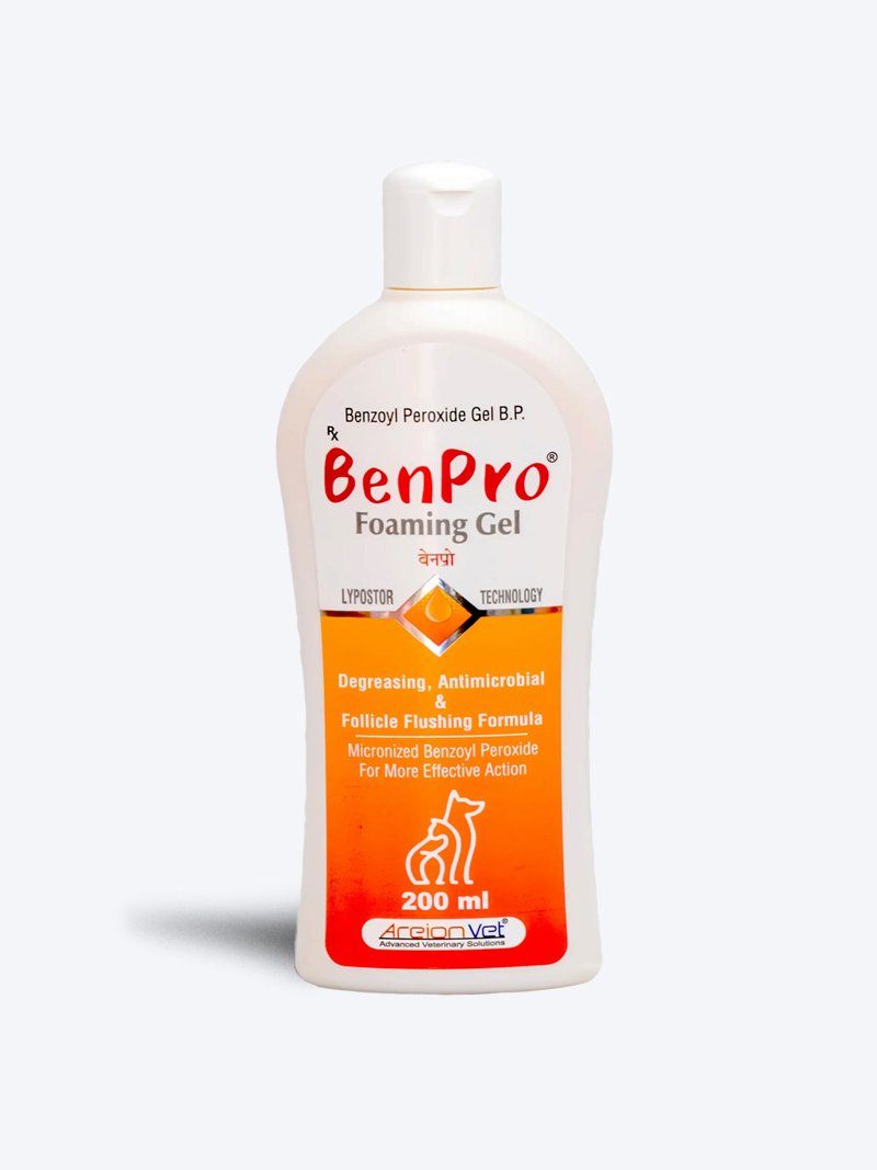 Benpro Foaming Gel is a medicated topical cleanser formulated for dogs and cats to help manage and prevent bacterial and fungal skin infections. Enriched with active ingredients like benzoyl peroxide, this foaming gel deeply cleanses the skin, unclogs pores, and removes excess oil, dirt, and debris. It is ideal for pets suffering from seborrhea, acne, or other skin conditions. The easy-to-apply foaming formula ensures effective contact with the skin, making it a practical choice for targeted skin care.