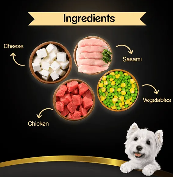 Gourmet pet food with Sasami chicken and vegetables, ensuring balanced nutrition.