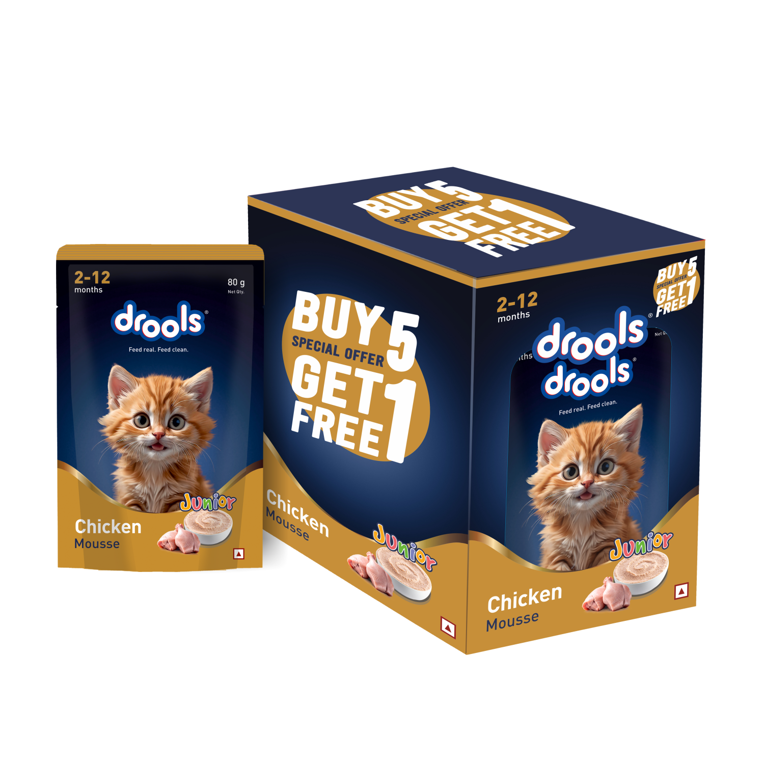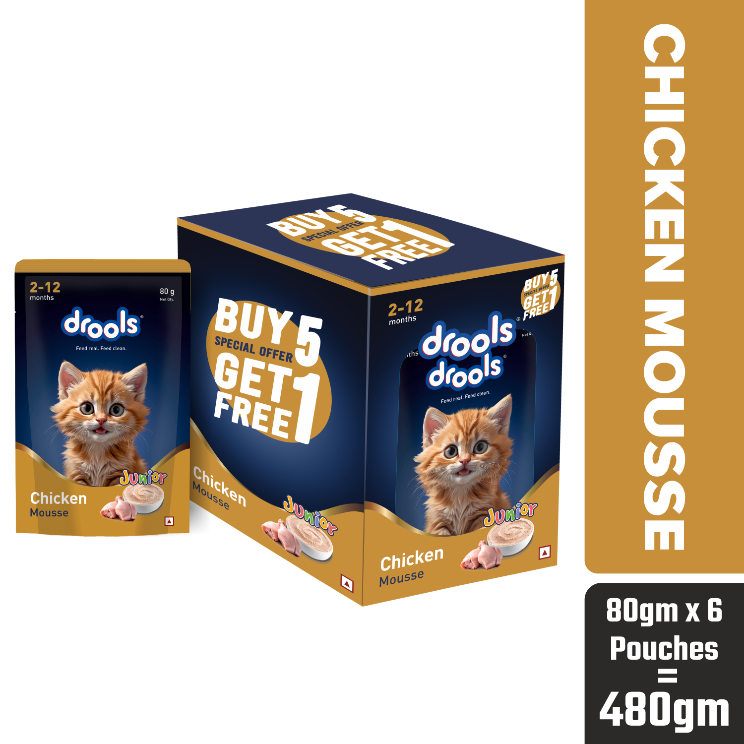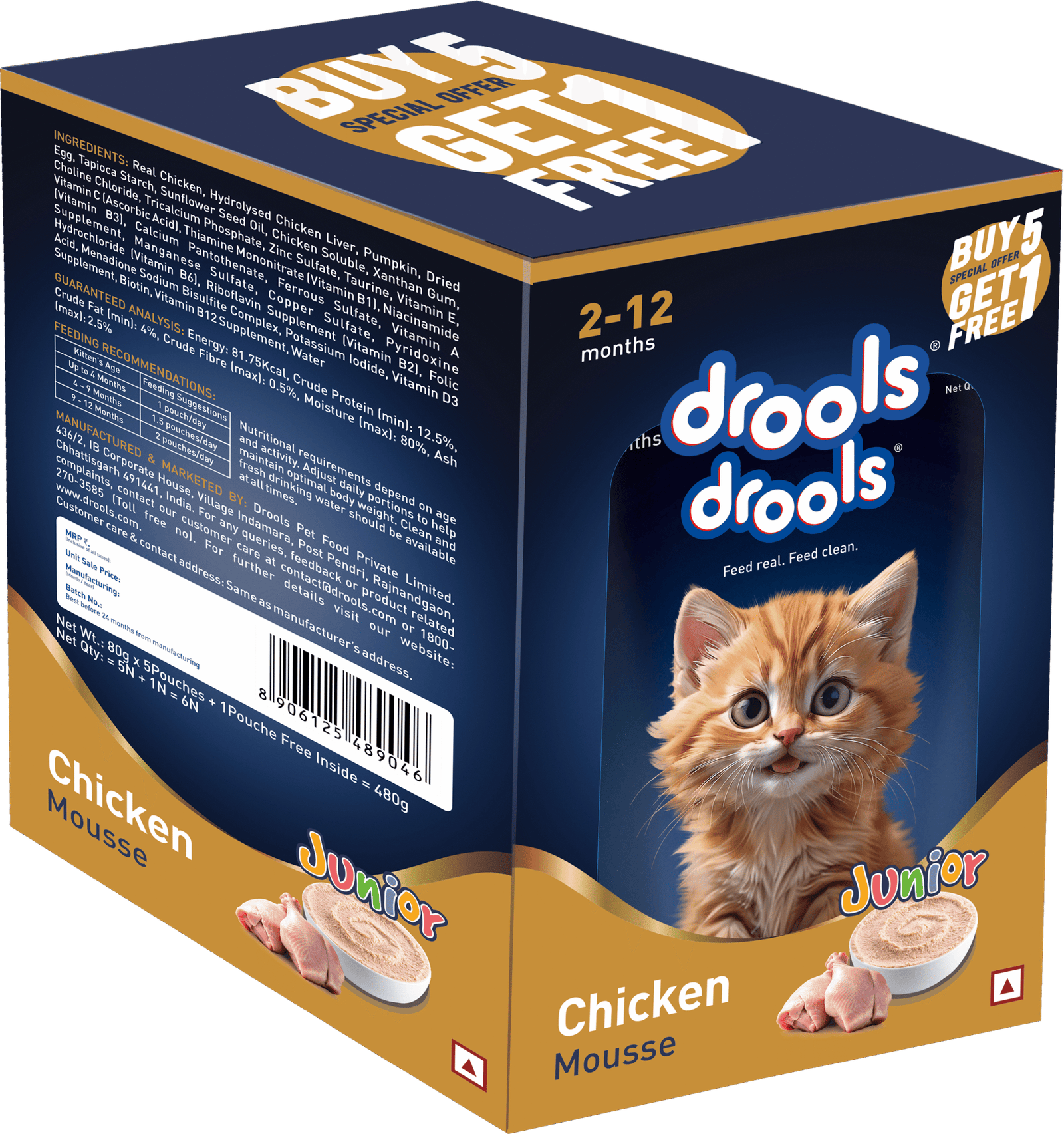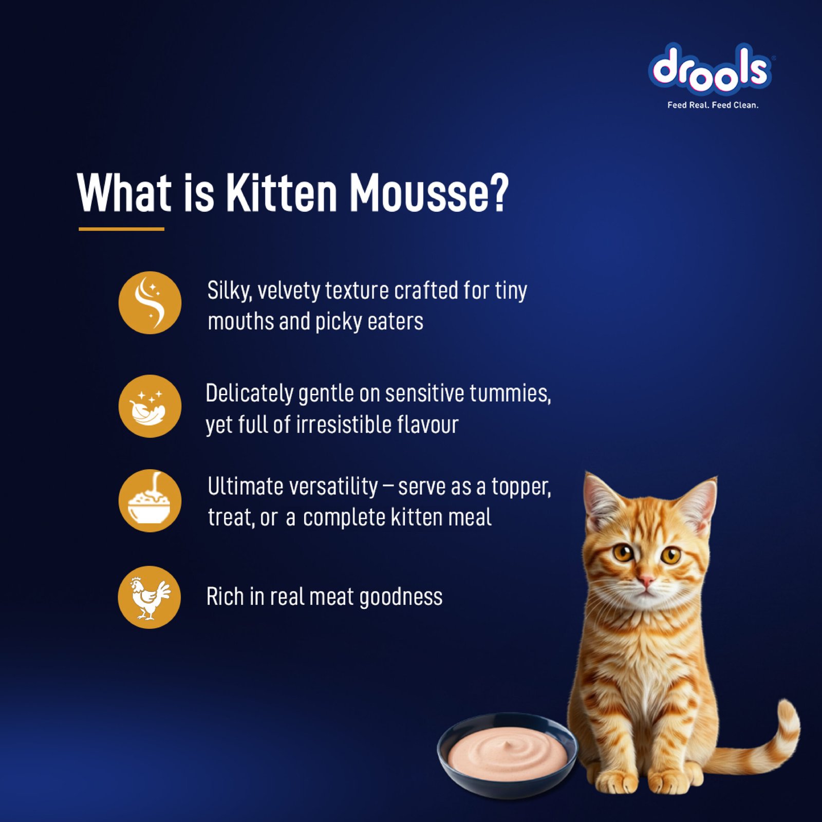 Drools Chicken Mousse is a soft, protein rich wet food specially crafted to support healthy growth and development in kittens. Made with real chicken, hydrolysed liver, and vital nutrients, it promotes strong immunity, optimal digestion, and healthy bone development. Enriched with taurine to support vision and heart health, its smooth texture is easy to lick and digest for young kittens. Free from artificial colors and preservatives, Drools Chicken Mousse ensures complete nutrition for a strong, active, and happy kitten.