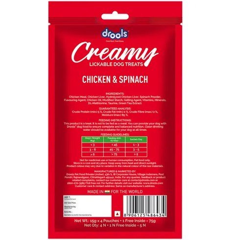 Indulge your furry friend with the delicious and nutritious Drools Creamy Lickable Dog Treat. Made with high-quality chicken meat and spinach, this treat is packed with protein, essential vitamins, and minerals. Fortified with taurine and green tea extract, it supports overall well-being while offering an irresistibly tasty experience