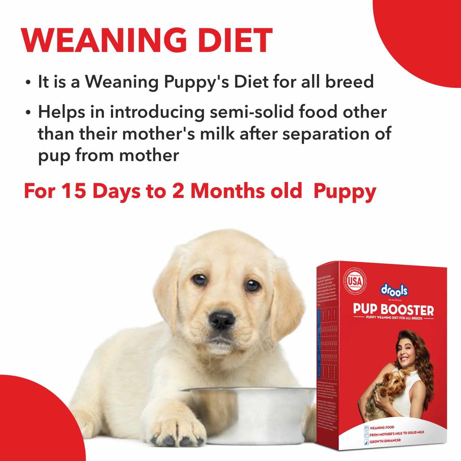 Drools Pup booster is precisely formulated to emulate the mother’s milk with an optimal balance of vitamin, minerals and other nutrients to support growth and development during weaning phase.