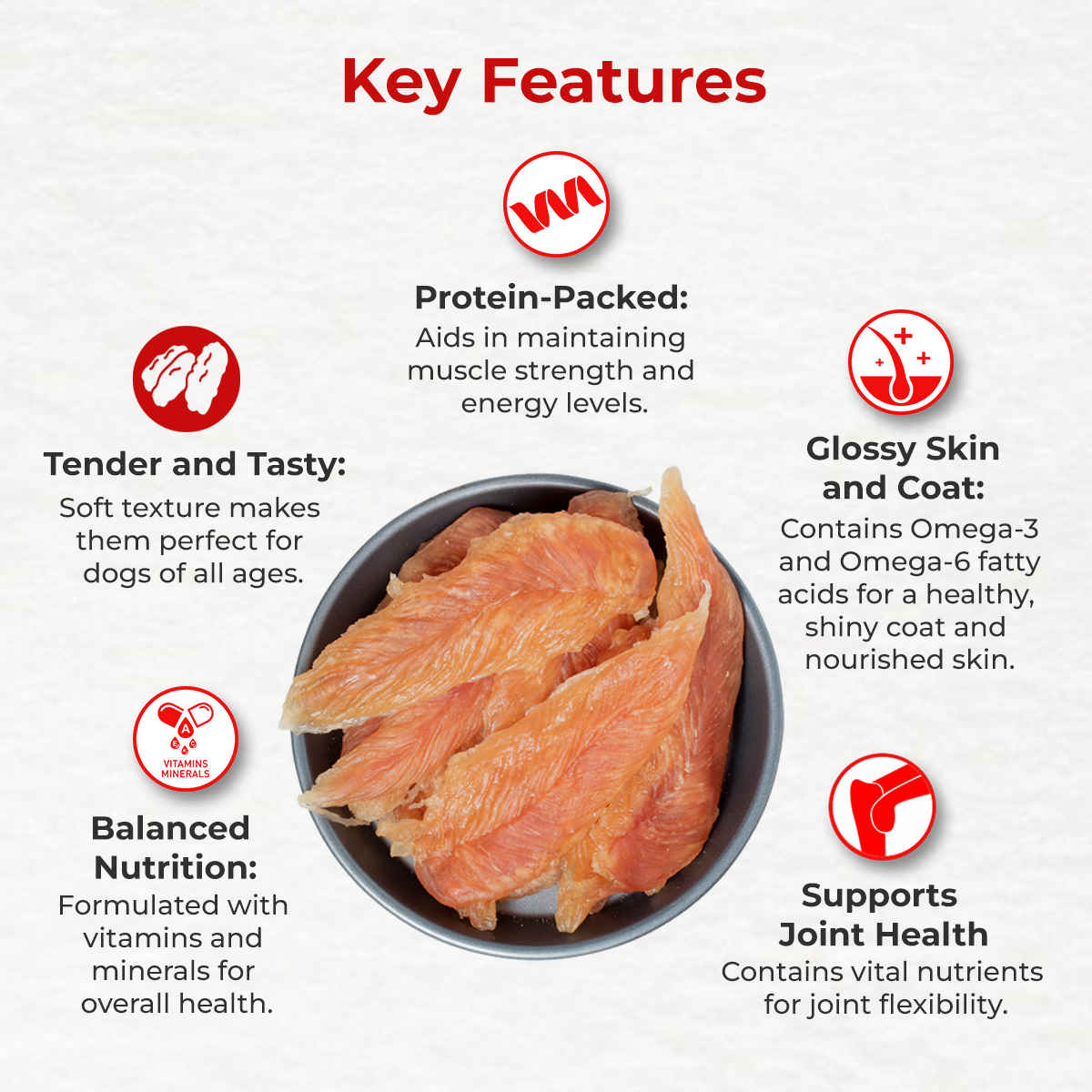 Treat your dog to the delicious flavor of our Chicken Tender Treats that will light up their eyes with joy. Made with high-quality protein, these savory treats offer both taste and nutrition. Perfect for snacking, but remember to feed in moderation and not as a meal replacement