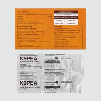 K9PEA is patented formulation of Palmitoylethanolamide(PEA), Genistein and Daidzein useful in Chronic Pain as well as Dermatitis. PEA is an endogenous fatty acid amide produced in response to stress and tissue damage, crucial for regulating chronic inflammation and pain.