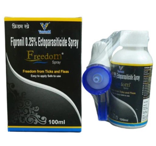 Venky’s Freedom spray contains fipronil which is an insecticide and acaricide belonging to the phenylpyrazole family. Its action results in an uncontrolled activity of central nervous system and death of insects or acarids. Fipronil has insecticidal and acaricidal effects on ticks, fleas and lice in dogs and cats.