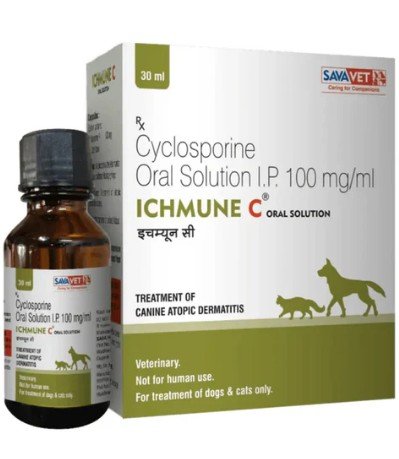 Savavet Ichmune oral solution contains Cyclosporine as an active ingredient which is a potent immunosuppressive agent. It works by supressing certain cells in the immune system that cause allergic reactions. It is indicated in the treatment of Atopic Dermatitis in dogs.
