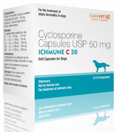 Savavet Ichmune C capsule contains Cyclosporine as an active ingredient which is a potent immunosuppressive agent. It works by supressing certain cells in the immune system that cause allergic reactions. It is indicated in the treatment of Atopic Dermatitis in dogs.