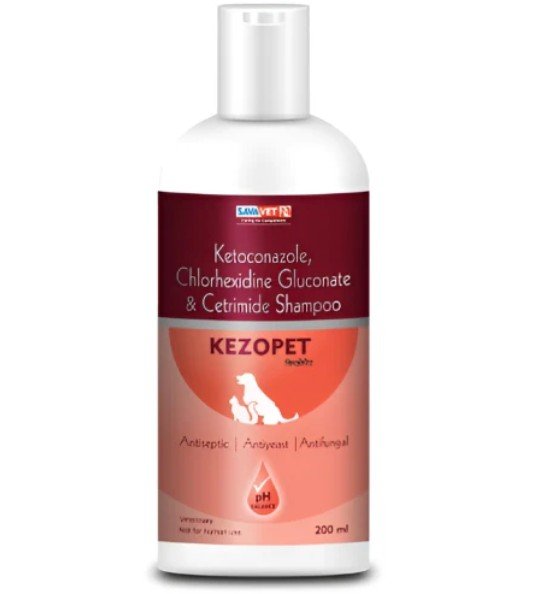 Kezopet is a broad-spectrum anti-fungal, antiseptic, and anti-yeast shampoo designed to provide Z-plus protection for companion animals. It contains Ketoconazole, Chlorhexidine, and Cetrimide, which work together to eliminate fungal and bacterial infections, promote healthy skin, and enhance coat shine. Kezopet is particularly effective against flaking, scaling, itching, seborrheic dermatitis, and ringworm infections in pets.