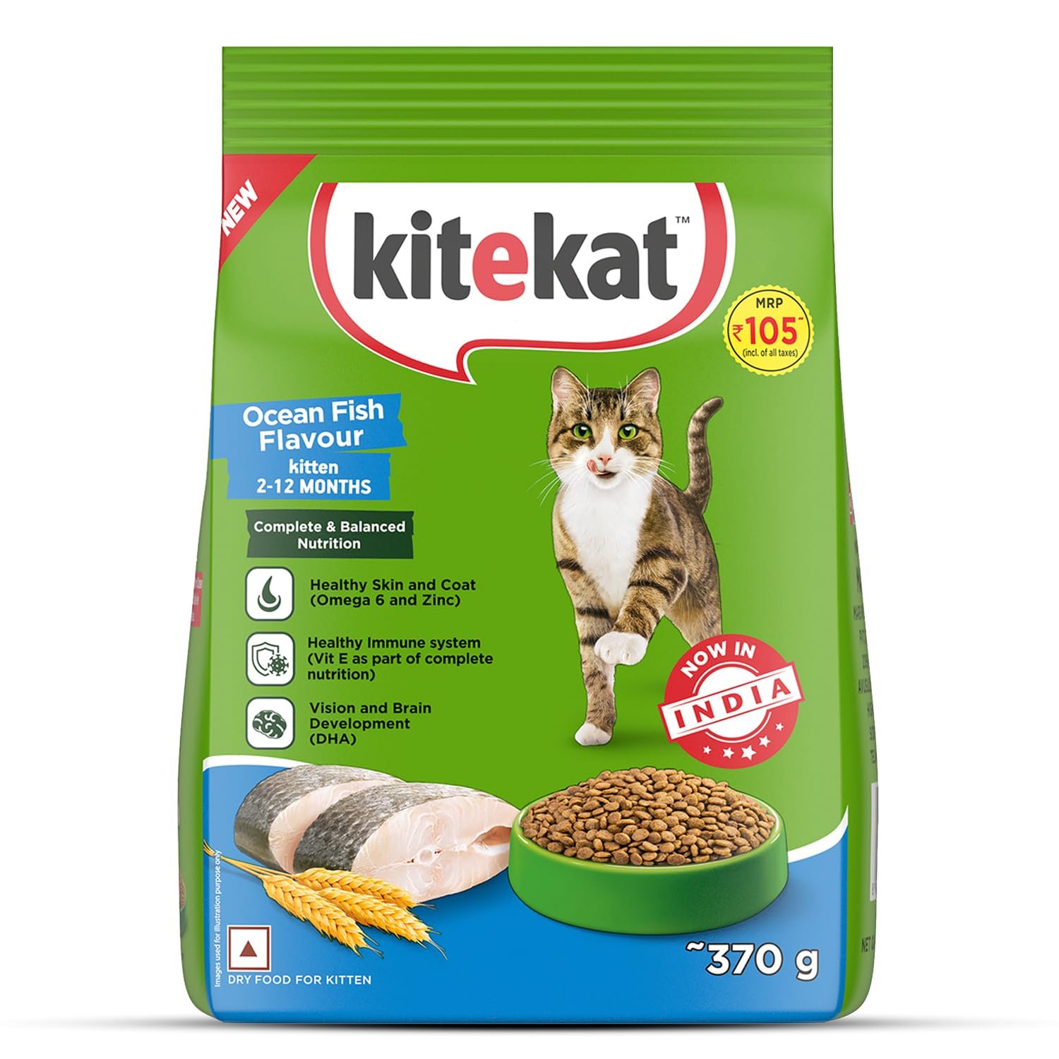 KITEKAT™ cat food provides complete and balanced nutrition for your little feline friend to grow healthy and energetic. KITEKAT™ Kitten Dry Cat Food, Ocean Fish Flavour, is packed with mouth-watering crunchy kibbles that delight your kitten. Made with quality ingredients such as fish, this dry cat food is specially formulated for kittens. It contains essential nutrients for their everyday energy. It includes Omega 6 & Zinc for healthy skin and coat as well as Vitamin E for your kitten’s healthy immune system. It contains DHA for vision and brain development along with high-quality protein content for healthy muscles and growth. In addition, it contains Calcium & Phosphorus for strong bones and teeth. KITEKAT™ kitten dry cat food is developed with nutritionists and veterinarians at Waltham Petcare Science Institute, a world-leading authority on pet care and nutrition. Refer to the back of the pack for the feeding guide. Support your kitten’s vitality and uncover their joy with KITEKAT™.