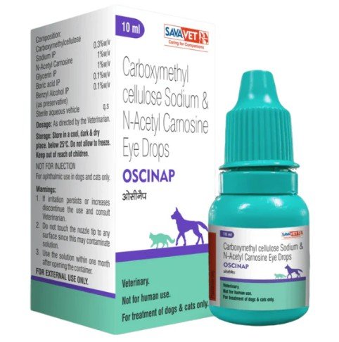 OSCINAP Eye Drops is a Veterinary formulation that combines 1% w/v N-acetyl carnosine (NAC) and 0.3% w/v Sodium Carboxymethylcellulose (SCMC). It helps in the management of cataract, reduces lens opacity and improves vision in cloudy eyes of dogs and cats.