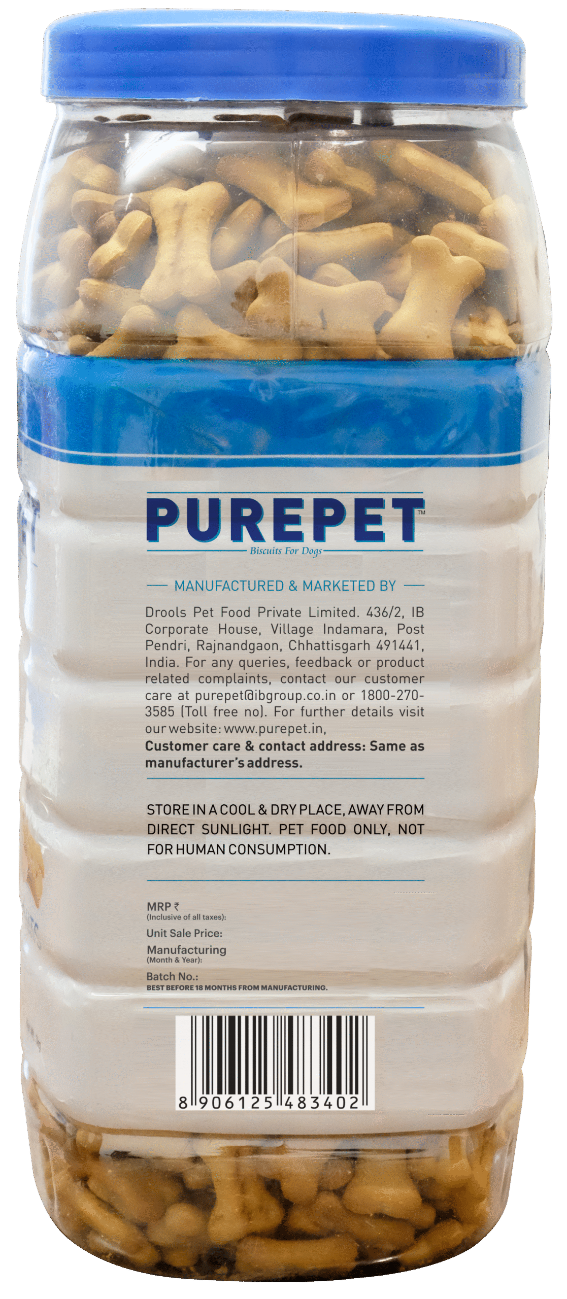 Purepet Dog Biscuits are nutritious dog treats which gives immense joy to your pet. They are made with Real Chicken, our #1 ingredient, with no added artificial colors or flavors. It helps to maintain clean teeth and also freshen breath by controlling the tartar build up, and promotes lustrous and healthy coat.
