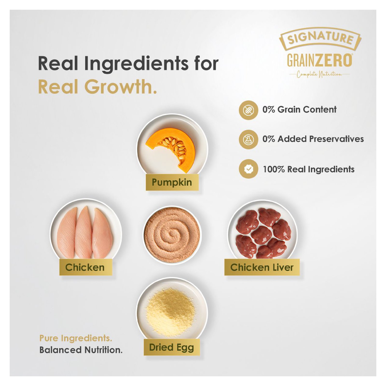 Real Chicken, Hydrolysed Chicken Liver, Pumpkin, Dried Egg, Tapioca Starch, Sunflower Seed Oil, Chicken Soluble, Xanthan Gum, Choline Chloride, Tricalcium Phosphate, Zinc Sulfate, Taurine, Vitamin E, Vitamin C (Ascorbic Acid), Thiamine Mononitrate (Vitamin B1), Niacinamide (Vitamin B3), Calcium Pantothenate, Ferrous Sulfate, Vitamin A Supplement, Manganese Sulfate, Copper Sulfate, Pyridoxine Hydrochloride (Vitamin B6), Riboflavin Supplement (Vitamin B2), Folic Acid, Menadione Sodium Bisulfite Complex, Potassium Iodide, Vitamin D3 Supplement, Biotin, Vitamin B12 Supplement, Water