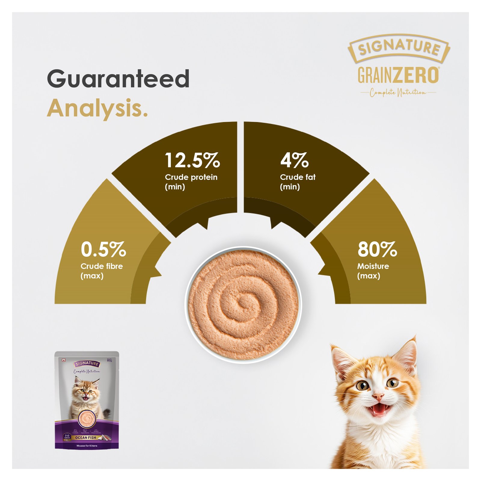 Energy: 81.75 Kcal, Crude Protein (min): 12.5%, Crude Fat (min): 4%, Crude Fibre (max): 0.5%, Moisture (max): 80%, Ash (max): 2.5%