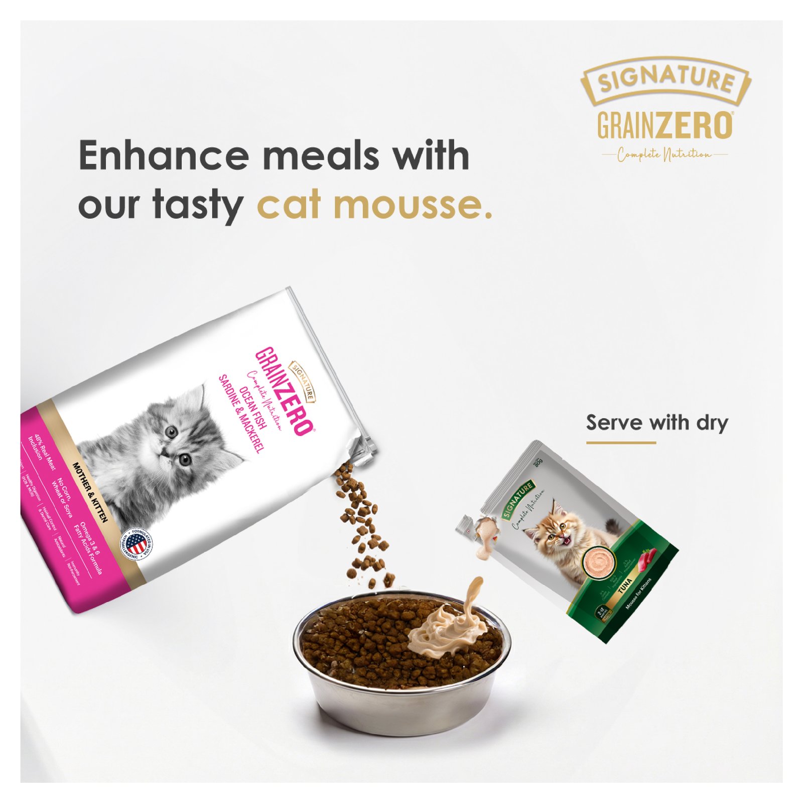 Experience the perfect harmony of nutrition and taste with Signature Tuna Mousse for Adult Cats. Crafted with Real tuna, Chicken and a blend of nutrient-rich superfoods, it helps support lean muscle, a glossy coat, and optimal hydration. Enriched with taurine and essential vitamins, it promotes a healthy heart, clear vision and overall vitality. Smooth, savoury, and irresistibly wholesome