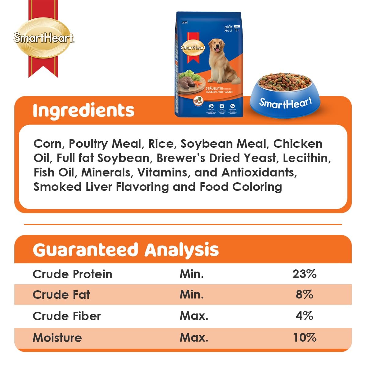 Adult dogs require complete and balanced nutrition that meets their requirements to maintain good health and condition. Smart Heart adult dog food is to meet adult dog’s requirements using the best quality ingredients and supplemented with fish oil (rich in DHA and Omega-3 fatty acid) and Lecithin (rich in Choline) to help enhance brain and nervous system function and promote heart health.