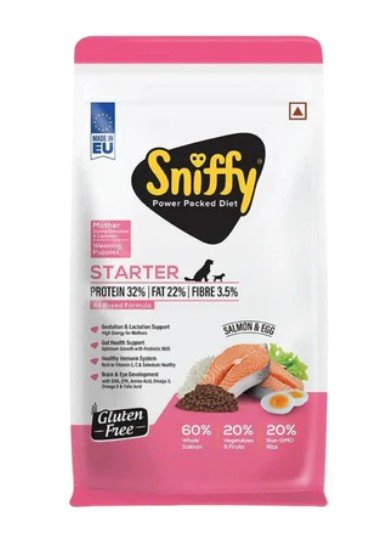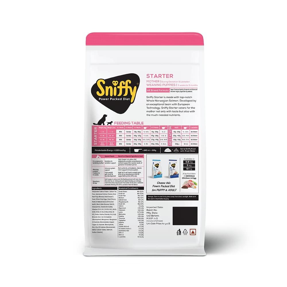 Top Notch Norwegian Salmon and Egg Formula: Sniffy Premium Starter Dry Dog Food is crafted with the goodness of real salmon and egg, providing your furry friend with a high-quality protein source for optimal muscle development and overall health.