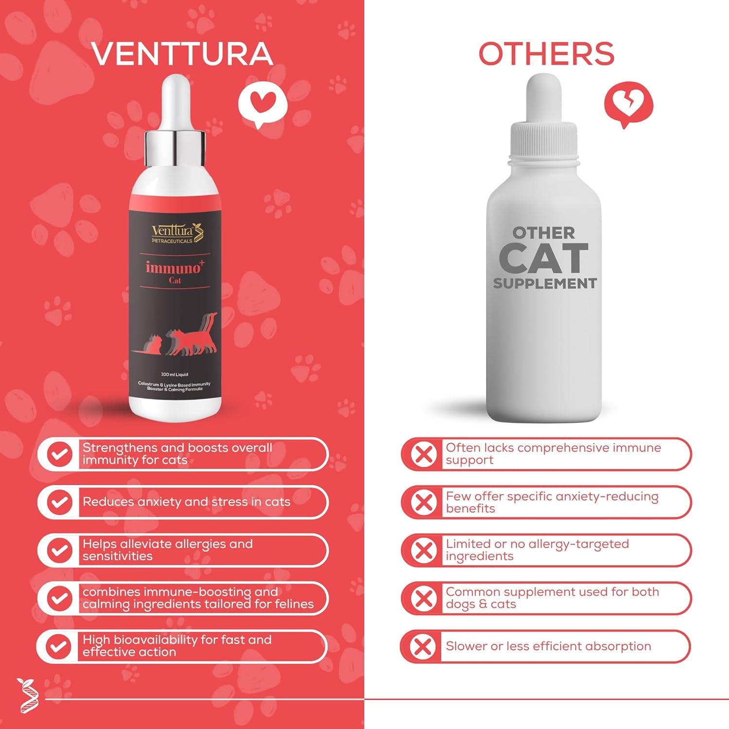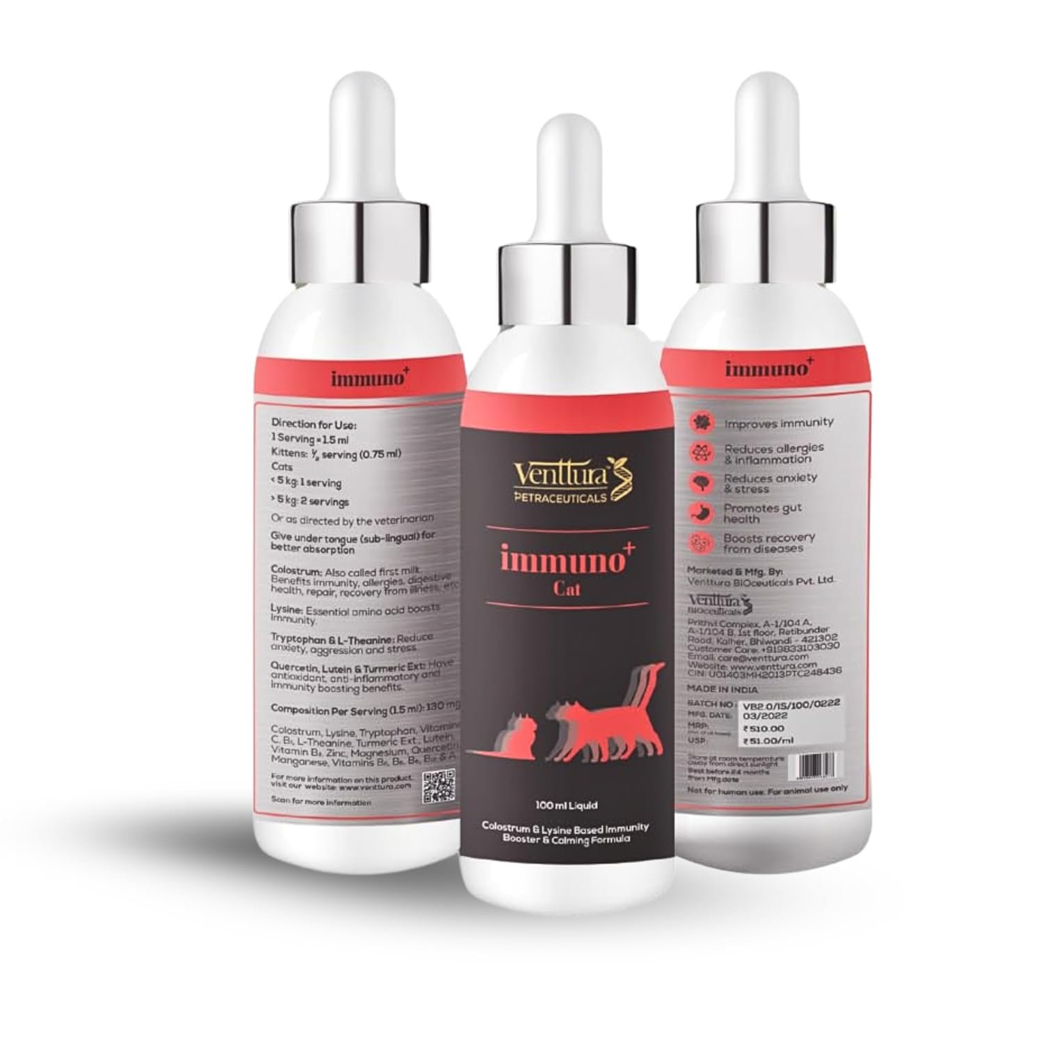 Boosts Immunity: Immuno+ Cat is a colostrum and lysine-based formula designed to strengthen immunity in kittens, adult, and geriatric cats.