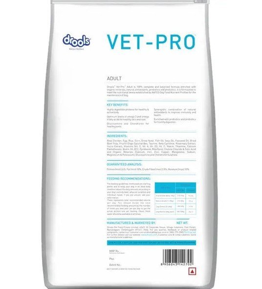 Drools VET PRO Adult Dog Dry Food is a premium adult dry dog food specifically designed to meet the nutritional requirements of adult dogs of all breeds. This carefully balanced formula is enriched with high-quality protein to support lean muscle mass, essential fatty acids for healthy skin and coat, and a blend of vitamins and minerals to boost the immune system.