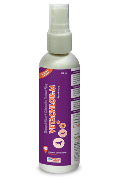 SavaVet Vetachlor-M Spray is a veterinary specific anti-microbial, anti-fungal and anti-bacterial drug prescribed by the vet for treatment of bacterial and fungal skin and hair infections in Dogs & Cats. It is also prescribed for rapid treatment of skin allergies caused by bacteria and fungi.