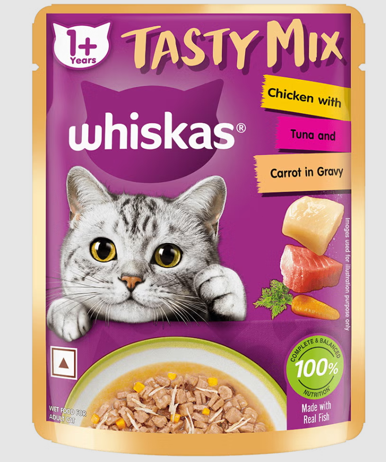 Whiskas Tasty Mix Adult (1+ Year) Wet Cat Food, Chicken with Tuna & Carrot in Gravy 85gm