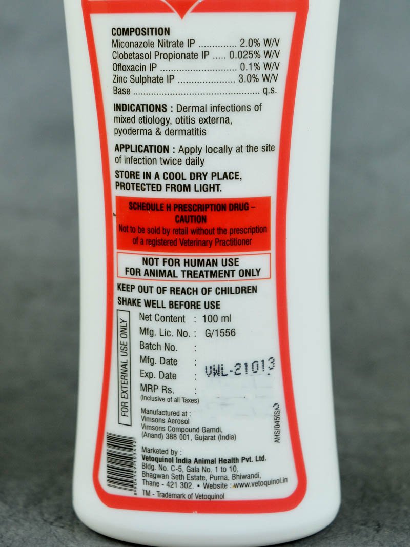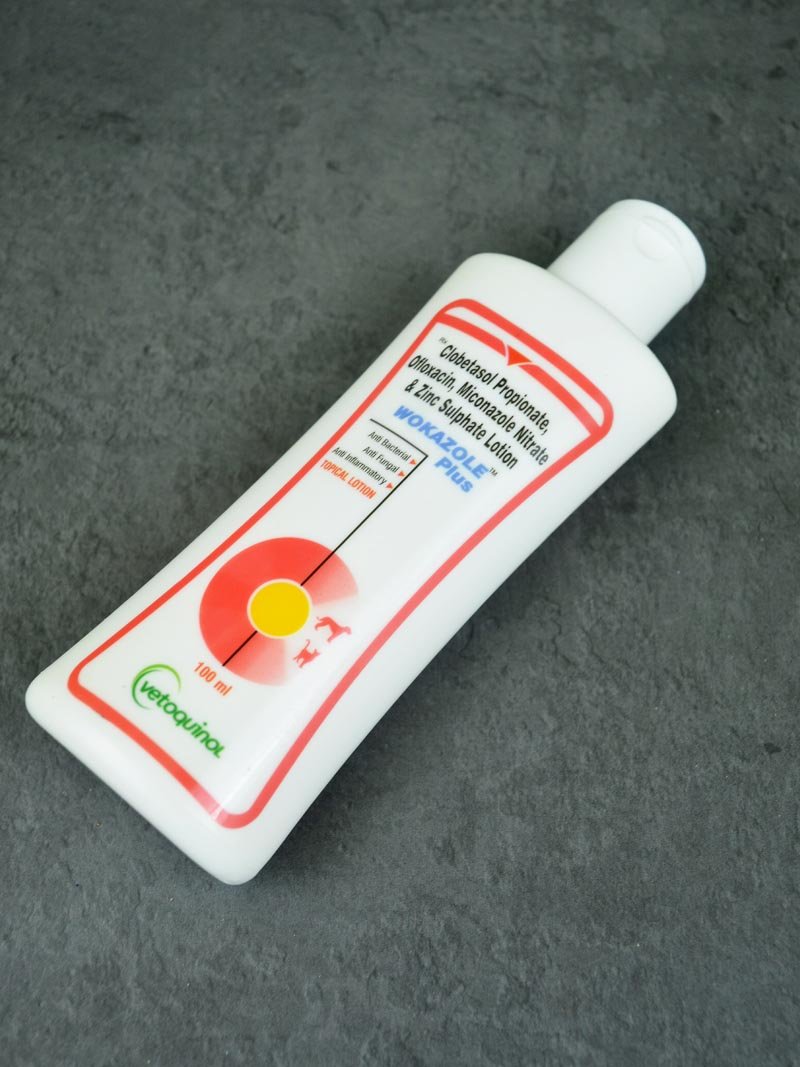 Wokazole Plus lotion is helpful in treating yeast and fungal skin infections in dogs and cats. Miconazole inhibits the synthesis of ergosterol, a major component of the fungal cell membrane and Ofloxacin causes inhibition of bacterial topoisomerase IV and DNA gyrase. Clobetasol interferes with the inflammatory process and pruritogenic pathway by inhibiting the arachidonic acid pathway, thereby lowering itching.