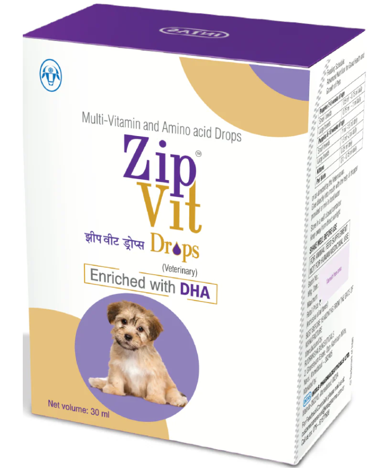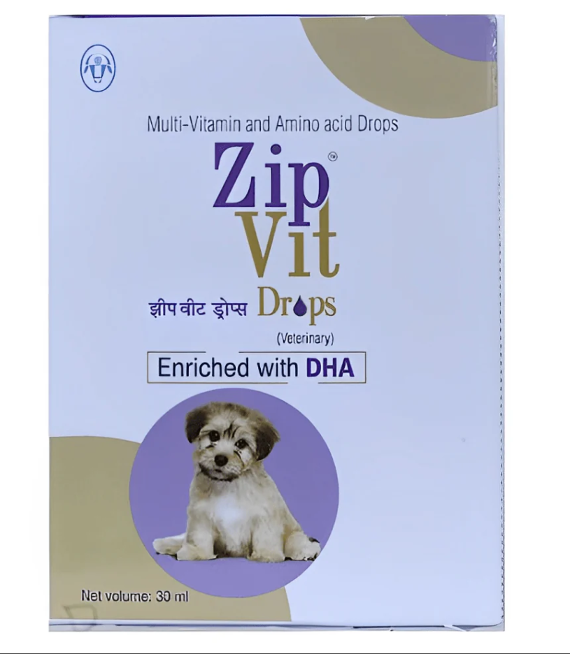 Intas ZipVit drops is a multivitamin and amino acid drop for dogs, cats and birds. It is suitable for pups and kittens, nursing or pregnant dogs / cats. It provides essential amino acids, B-complex in a palatable formulation. It supports growth, immunity in young animals and stimulates appetite in anorexic pets. It promotes absolute muscle structure in pets.